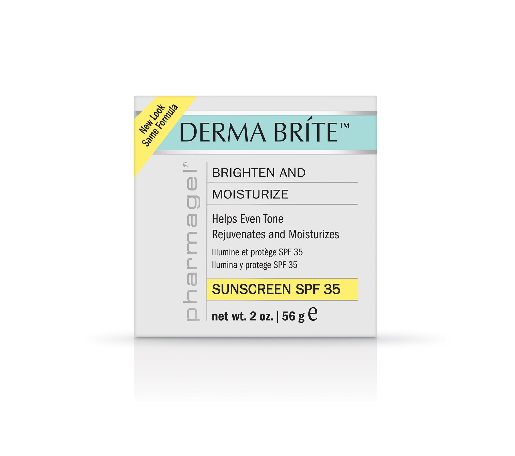 This creamy moisturizer contains a special blend of ingredients to reduce the appearance of discoloration and hyperpigmentation caused by exposure to the elements and the normal aging process.  Hydroquinone-free, the ingredients in Derma Bríte® have been shown to help gently fade the appearance of discoloration to reveal a brighter, more radiant complexion.  Containing four effective sunscreens, Pharmagel Derma Bríte® offers broad spectrum SPF 35 protection to shield skin from the sun's damaging UV rays.